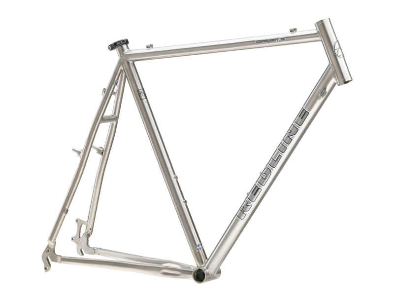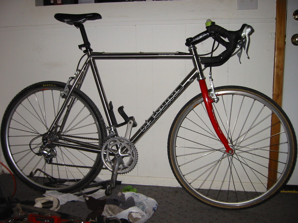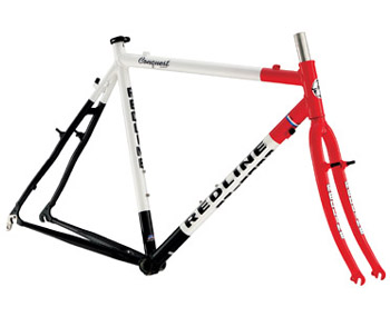 - '99 Redline Conquest Cyclo-X - the cross/commute bike! That broke in 2003! Pictures here! Size 58cm c-c, welded 7005 frame (and fork?) white with red decals, (warranty replacement is a 2003 Conquest Pro frame, red/white/black w/1-1/8" steer & therefore new headset and stem - Forgie 135mm) (semi-warranty replacement for that one is a 2005 Conquest Ti frame, same red fork) 175mm 53-39 RX100 crank/STI levers/front derailleur, 105 rear derailleur, some Shimano BB, STX cantilever brakes, 13-26 cogs, RSX 32-hole hubs with random Araya rims - retired due to excessive spoke breakage, replaced with 32h Ultegra/OpenPro from Colorado Cyclist, old school M747 SPD pedals, Modolo bars, Velo saddle, random seatpost and Aheadstem, Redline-branded knobbly 700x35c tires.