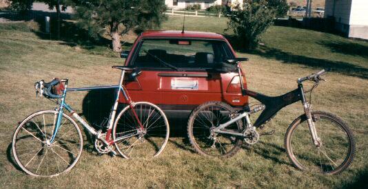 - '96 Trek Y-22 - Now with saggy 2nd shock, reason to get some Sugar (above) - but pressed into occasional service as commuter bike when other bikes break. Back in '99, went for some new components. Size large,